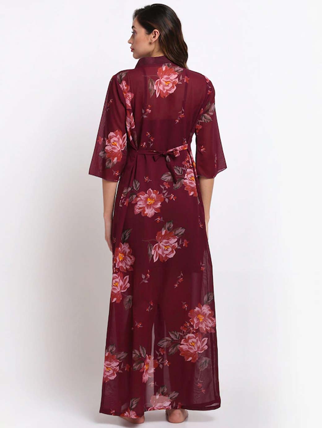 Burgundy & Pink Floral Printed Nightdress With Robe