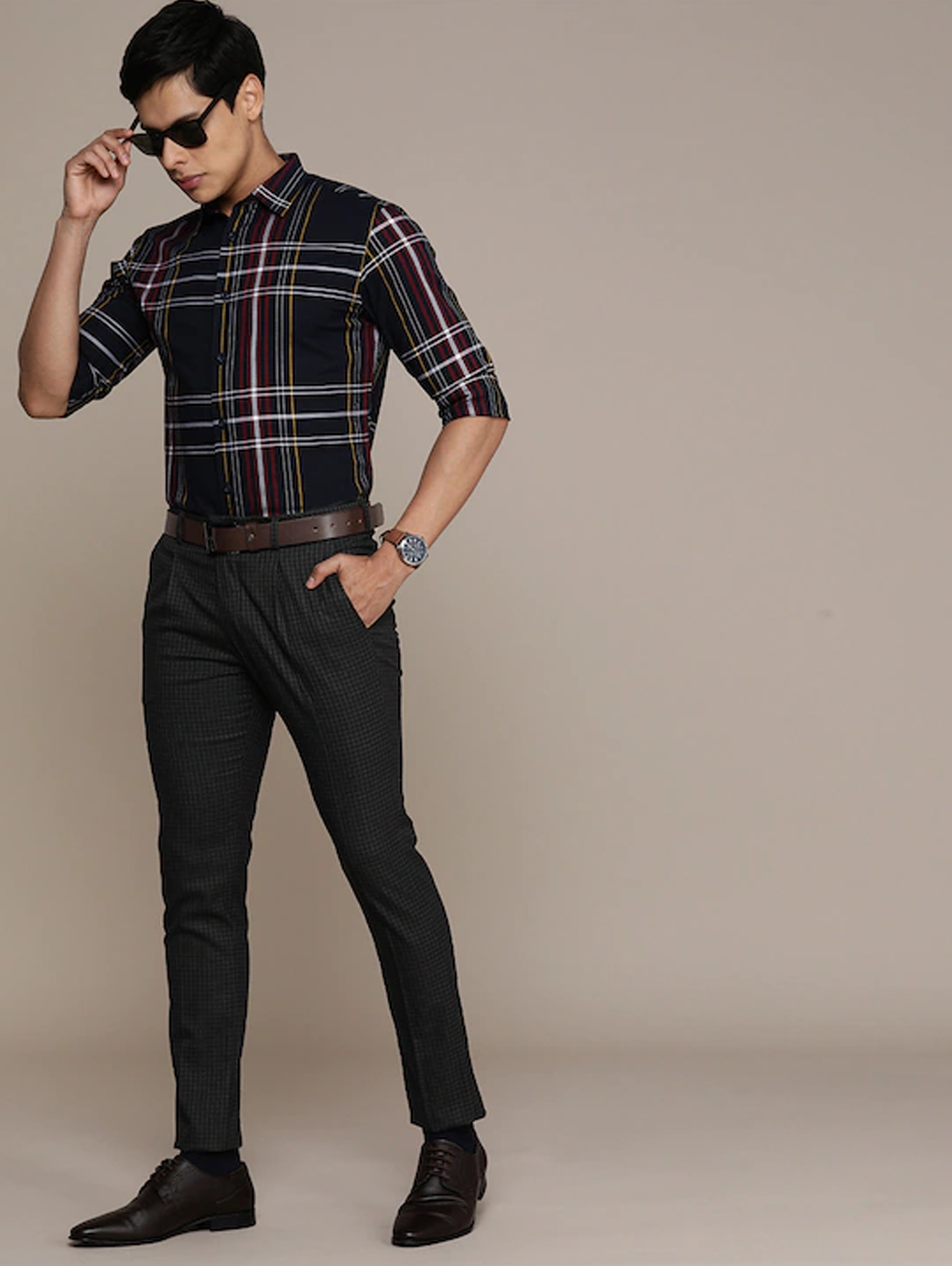 Men Black & Grey Checked Slim Fit Pleated Formal Trousers