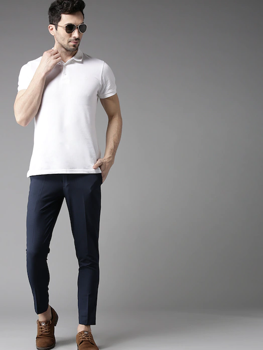 Navy Blue solid mid-rise trousers, has a hook and bar closure, four pockets