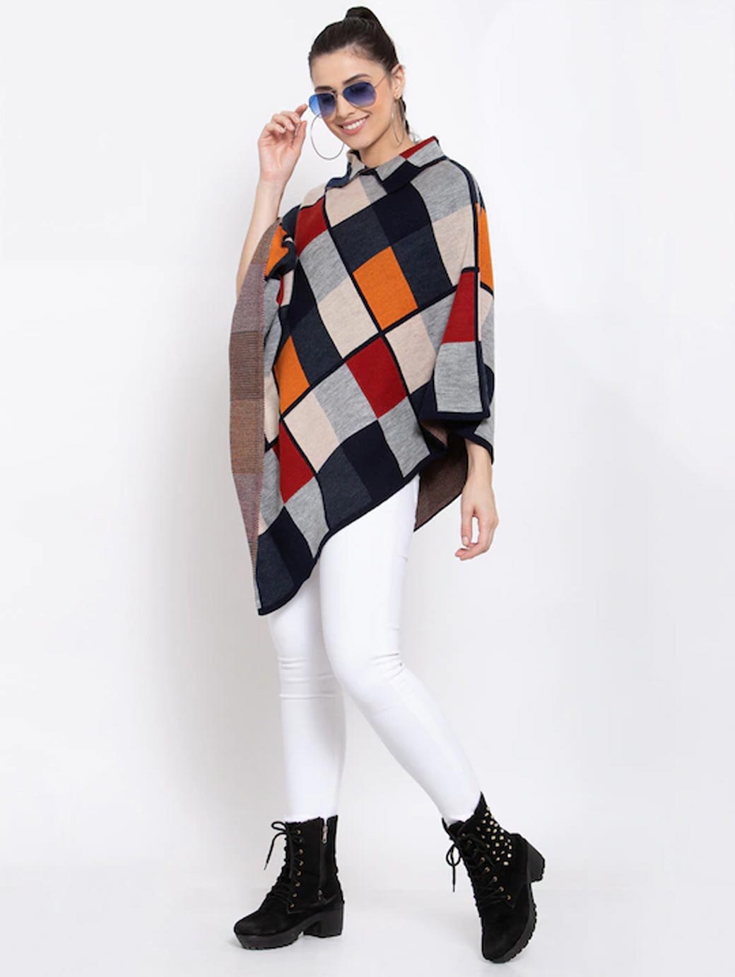 Beige and grey checked lapel regular shrug ,has long sleeves, straight hem