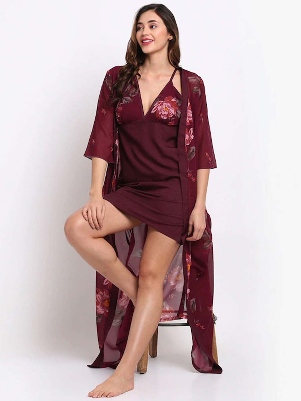 Burgundy & Pink Floral Printed Nightdress With Robe