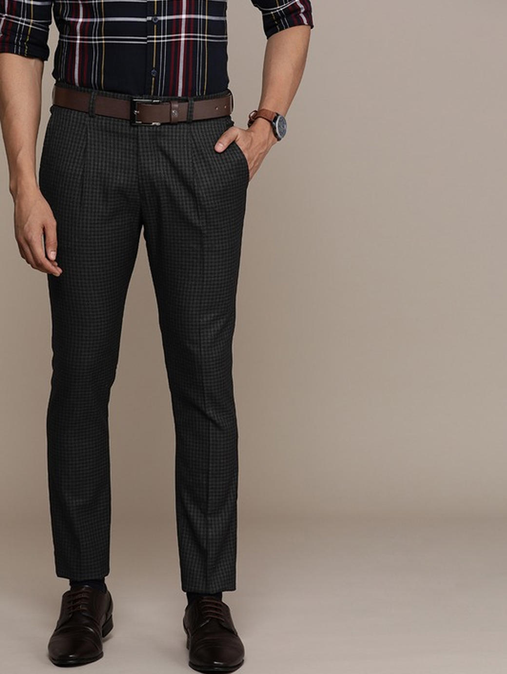 Men Black & Grey Checked Slim Fit Pleated Formal Trousers