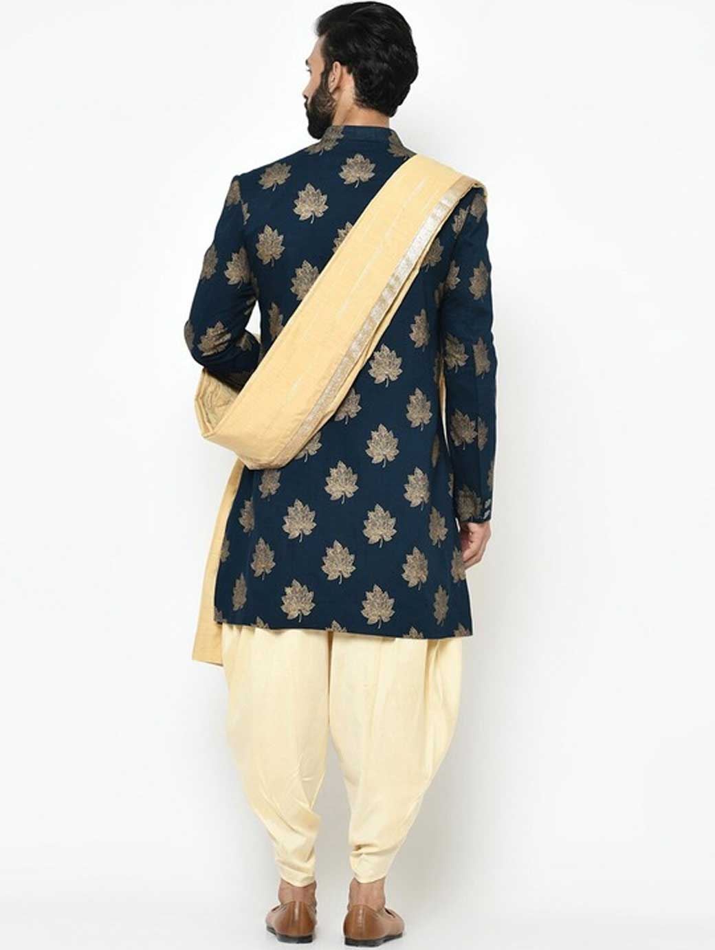 Men Navy Blue & Gold Printed Sherwani with Dhoti Pants