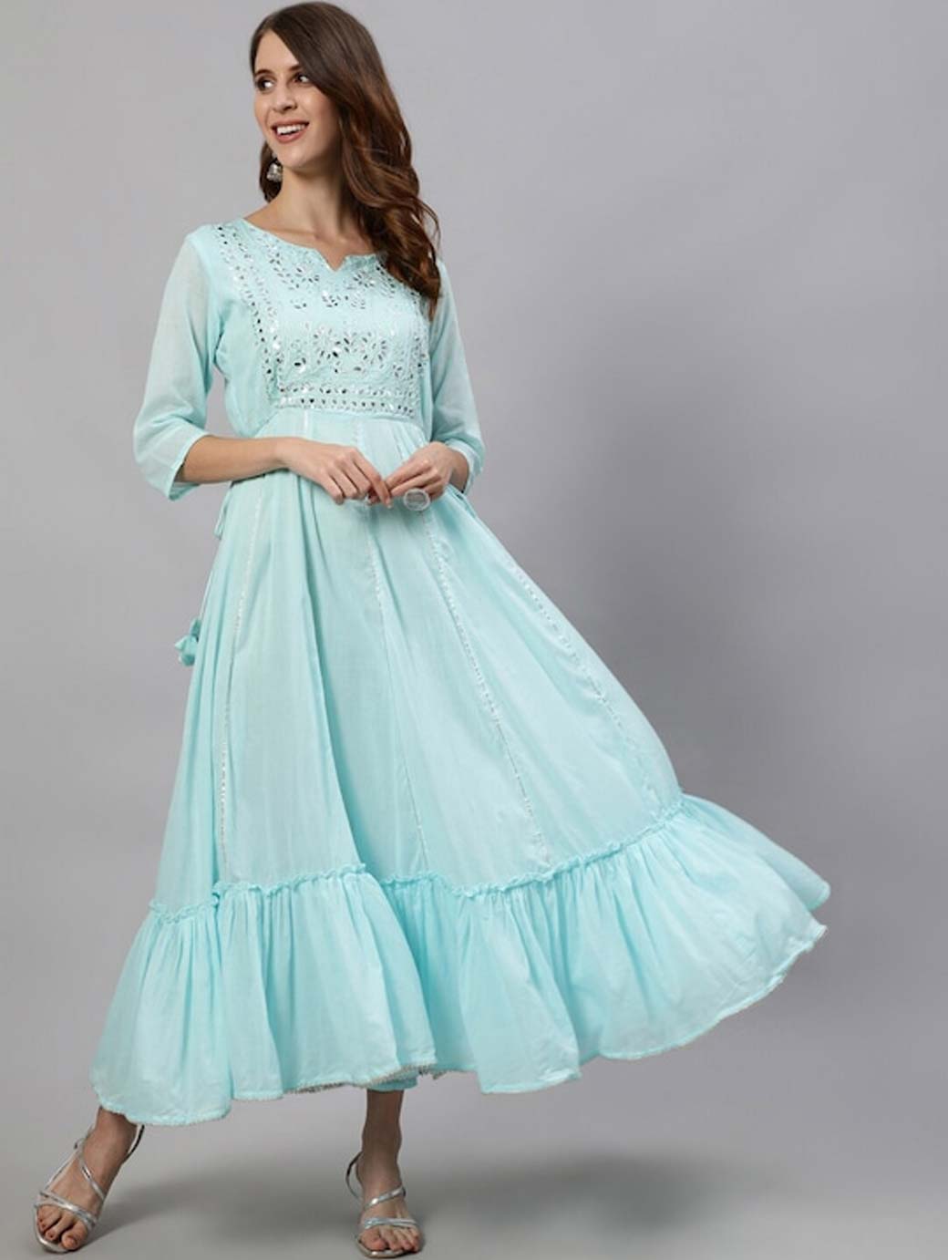 Women Blue Yoke Design Mirror Work Pure Cotton Anarkali Kurta