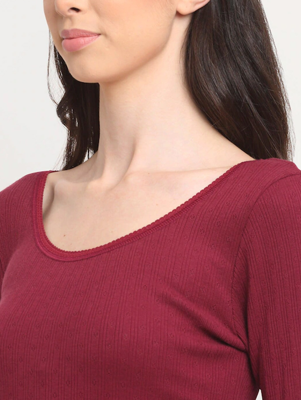 Maroon Self-Design thermal top, has a round-neck, full sleeves