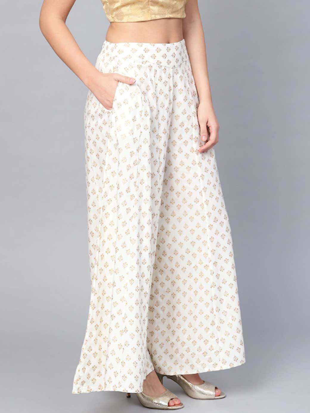A pair of Off-white and golden printed woven flared Palazzos, has a partially elasticated waistband, opaque, 1 pocket